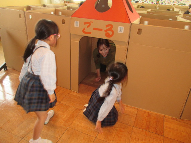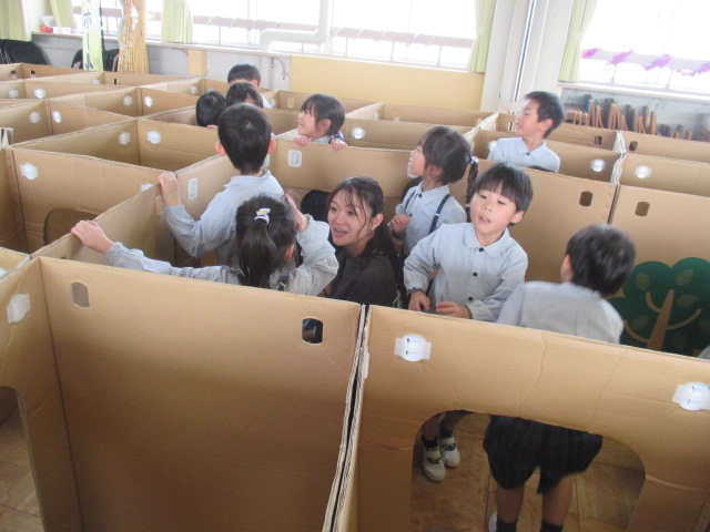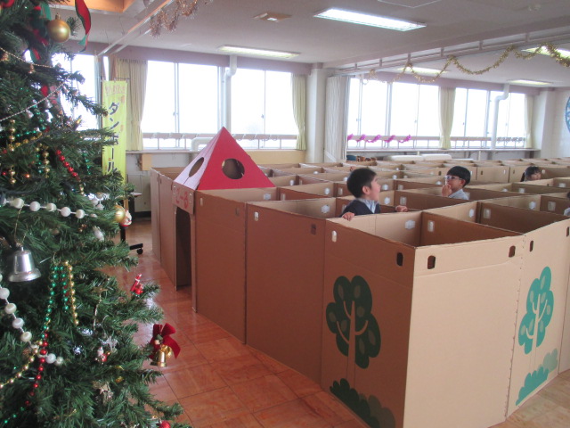 ホールに大きな段ボール迷路♪